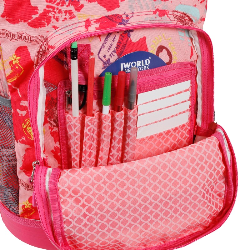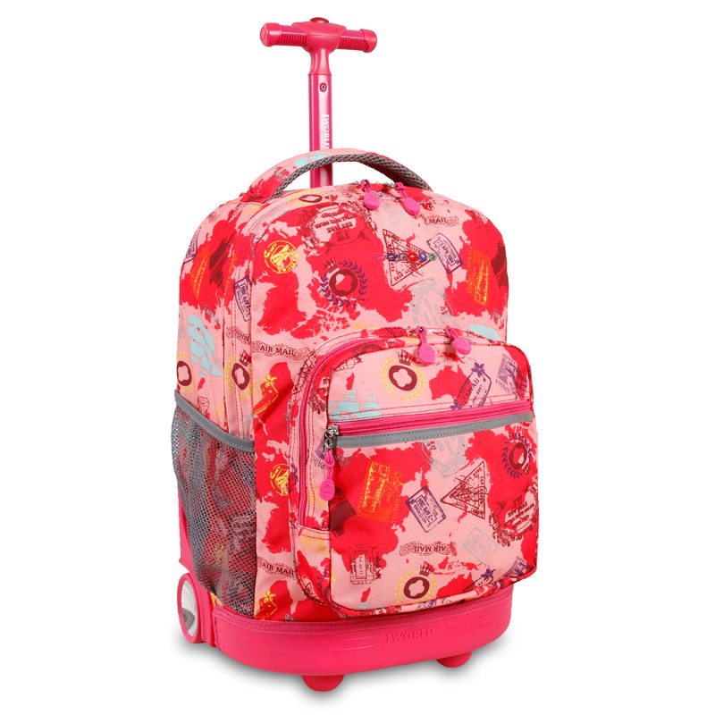 Go traveling, back to school, or to a sleepover in style, with your belongings neatly stowed in the J World Sunrise Rolling Backpack. The versatility of the Sunrise Rolling Backpack allows for it function as both carry- on luggage that will fit under the airplane seat or overhead compartment and a strapped backpack for students. It has fully functional wheels that are both soft and noiseless that allows for a controlled motion. Organize all of your belongings with a front pocket equipped with a pencil holder, key fob and mesh pocket perfect for storing items that can be easily accessed. For the people on the go in need of hydration, it has side mesh pockets that are ideal for storing water bottles and various other drink containers.